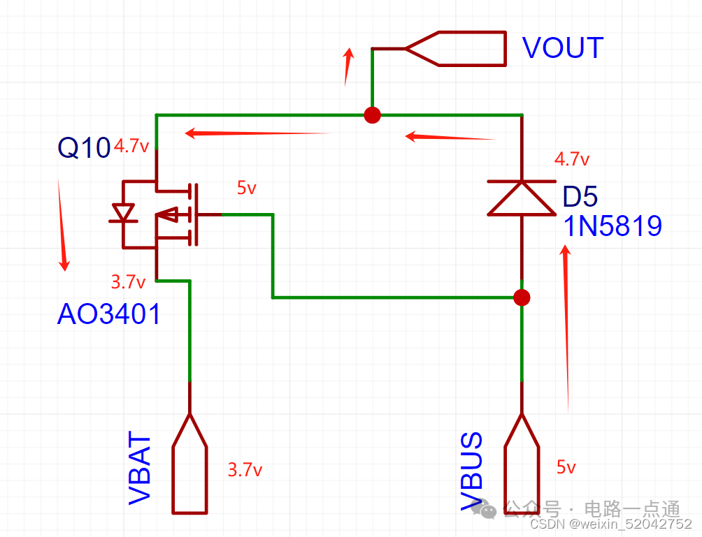 二极管组成。为了便于理解,我们假设电池电压为 3.7V,USB 电源电压为 5.0V。
